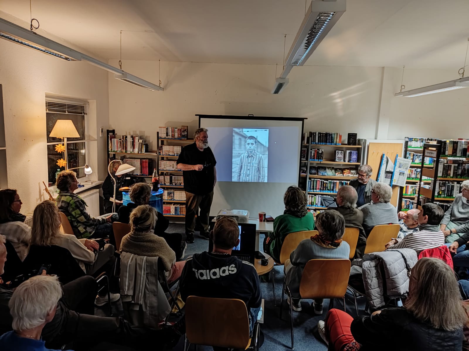 Heiligenhafen – Mit eindring lichen Liedern eröffnete Detlev Uhle die dritte Veranstaltung der Geschichts- und Literaturwerkstatt „Das BullAuge“in der Stadtbücherei Heiligenhafen. Sein musikalischer Auftakt stimmte die zahlreichen Gäste auf einen Abend ein, der sich auf vielfältige Weise der Erinnerungskultur widmete.