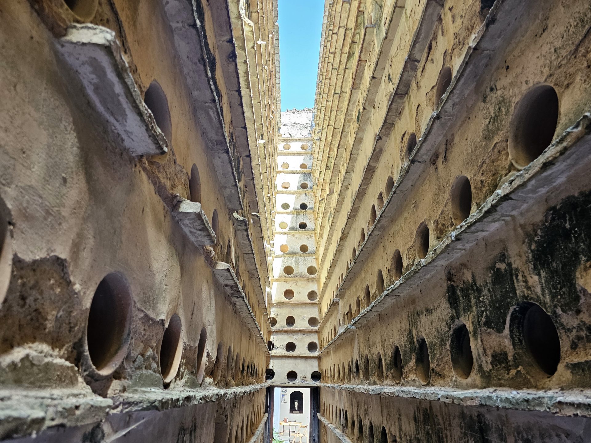 Die Anlage erstreckt sich über stolze 400 Quadratmeter und ist noch immer durch ihre beeindruckende Struktur geprägt. Über 7.770 Taubennester aus Terrakotta reihen sich entlang der Innenwände, die bis zu elf Meter hoch und extrem massiv sind – gebaut, um den Vögeln thermischen Komfort und Schutz vor Wind, Regen und Raubtieren zu bieten. Zwischen den parallelen „Straßen“ des Hofes fließt ein schmaler Kanal, der den Tauben früher als Trink- und Badegelegenheit diente. Heute ist der Palomar Teil eines Landhaushotels, doch die architektonische Pracht und das historische Erbe sind noch klar erkennbar.