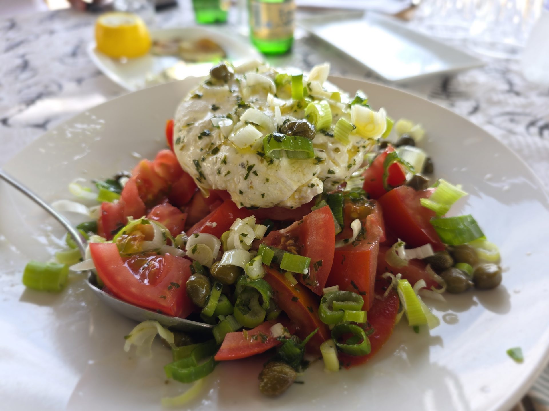 Dice the tomatoes and mix them with salt, thyme, oregano, and a generous drizzle of olive oil until they release their juices. Slice the spring onions into thin rings and set aside. For the cream, blend the feta with cream cheese and olive oil, then gradually fold in the Greek yogurt until smooth and firm. Season with a little salt.