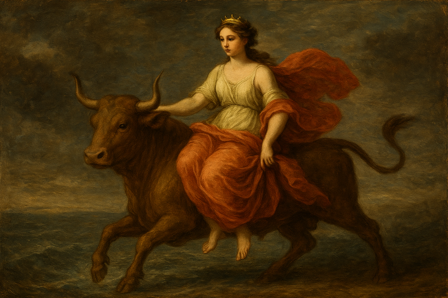 Götter & Gelehrte – Die Geschichte beginnt in Phönizien (dem heutigen Libanon), wo Europa mit ihren Gefährtinnen am Strand Blumen pflückt. Zeus, von ihrer Schönheit fasziniert, beschließt sie zu entführen. Um ihr Vertrauen zu gewinnen verwandelt er sich in einen prächtigen weißen Stier mit goldenen Hörnern. Europa, angezogen von der Sanftheit und Majestät des Tieres, nähert sich ihm und steigt schließlich auf seinen Rücken.