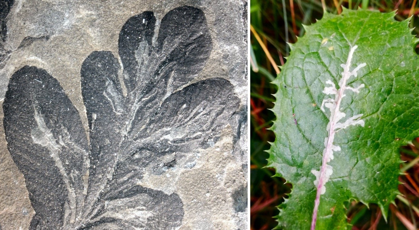 Links: die ältesten bekannten Blattminen (Asteronomus maeandriformis) der Erdgeschichte aus dem Perm von Thüringen (links). Blattminen der Minierfliege Liriomyza an einer Gänsedistel (rechts). Foto: Laass et al
