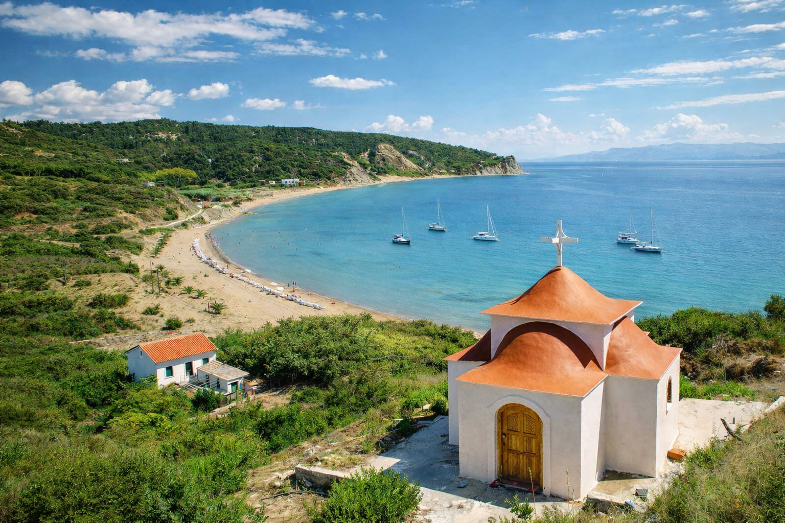 Mathraki, die kleinste der drei bewohnten Inseln, besticht durch ihre üppige Vegetation und die Nähe zum albanischen Festland. Die sanften Hügel und idyllischen Strände laden zum Verweilen ein. Besonders beeindruckend ist der Blick von den höheren Punkten der Insel, der einen Panoramablick auf die albanische Küste ermöglicht. Die wenigen Bewohner leben hauptsächlich vom Fischfang und der Landwirtschaft, was der Insel einen authentischen und makellosen Charakter verleiht.