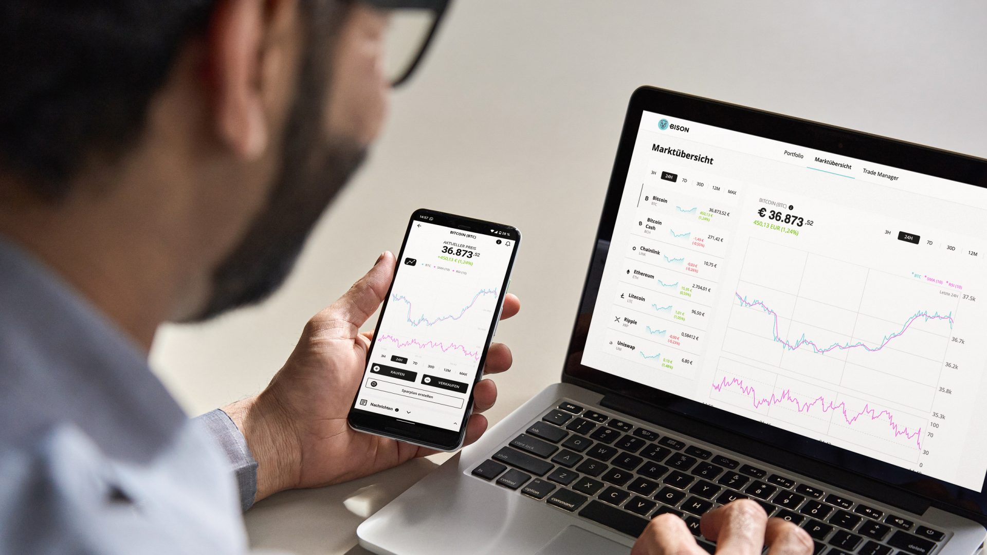 BISON zeigt immer den aktuellen Kauf- und Verkaufspreis an, zu dem man Kryptowährungen handeln kann. Der Handel von Kryptowährungen ist gebührenfrei. Es fällt lediglich der anteilige Spread an, also der Unterschied zwischen Kaufpreis und Verkaufspreis. Die intuitive Oberfläche für Nutzer:innen sowie die App am Smartphone erleichtern den Zugang, bei Fragen und Problemen unterstützt ein verlässlicher Kundendienst. Neuanleger:innen, die überlegen, ihr Portfolio mit Kryptowährungen zu diversifizieren, können mit einer regulierten Plattform wie BISON einfach und sicher in den Handel einsteigen.
