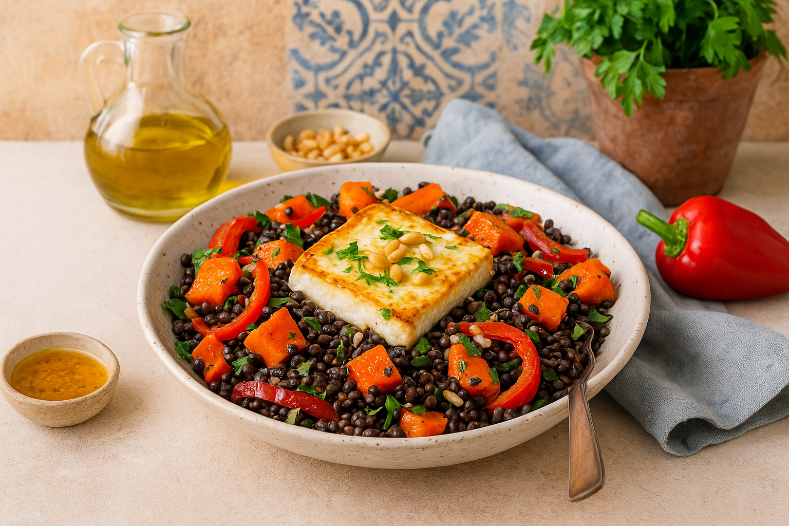 Μια πινελιά Μεσογείου στο πιάτο: Η ελληνική κουζίνα ζει από απλά υλικά, γεμάτα γεύση και φρεσκάδα. Αυτή η σαλάτα με φακές και κολοκύθα συνδυάζει τα αρώματα του φθινοπώρου με τη μεσογειακή ελαφρότητα – η κρεμώδης φέτα συναντά τις καρυδένιες φακές beluga, τη γλυκιά ψητή κολοκύθα και τις τραγανές πιπεριές.