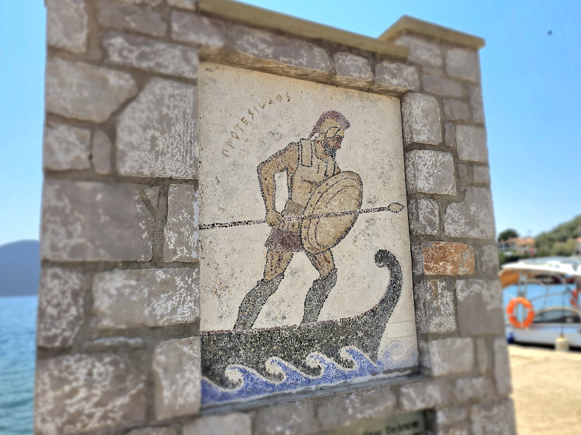 Götter & Gelehrte – Protesilaos (altgriechisch Πρωτεσίλαος Prōtesílaos, lateinisch Protesilaus) war einer der Freier von Helena und regierte als Fürst über Phylake und die umliegenden Gebiete. Kurz vor seinem Aufbruch nach Troja heiratete er Laodameia. Beim Ankommen der griechischen Flotte sprang er als erster ans trojanische Ufer, obwohl ein Orakelspruch prophezeit hatte, dass der erste Grieche, der asiatischen Boden betritt, auch als erster sterben müsse. Mutig stellte er sich diesem Schicksal, tötete mehrere Trojaner und fand schließlich durch die Hand des trojanischen Fürsten Aeneas (manchmal auch Hektor, Euphorbos, Achates oder Kyknos genannt) den Tod.