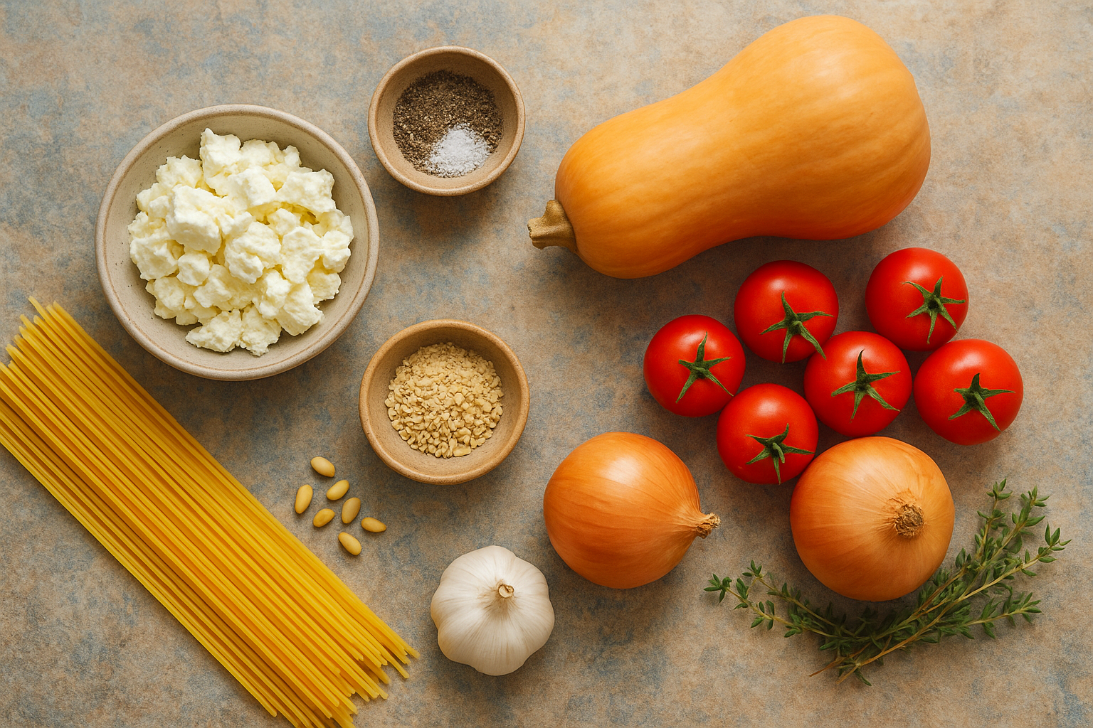 Preheat the oven to 180°C. Peel the butternut squash and remove the seeds. Cut into small pieces. Halve the cherry tomatoes, slice the onions into rings, and press the garlic cloves. Place everything in a baking dish and mix with a good drizzle of olive oil. Season with salt, pepper, and thyme. Make space in the middle for the whole feta and bake everything together for 45 minutes.