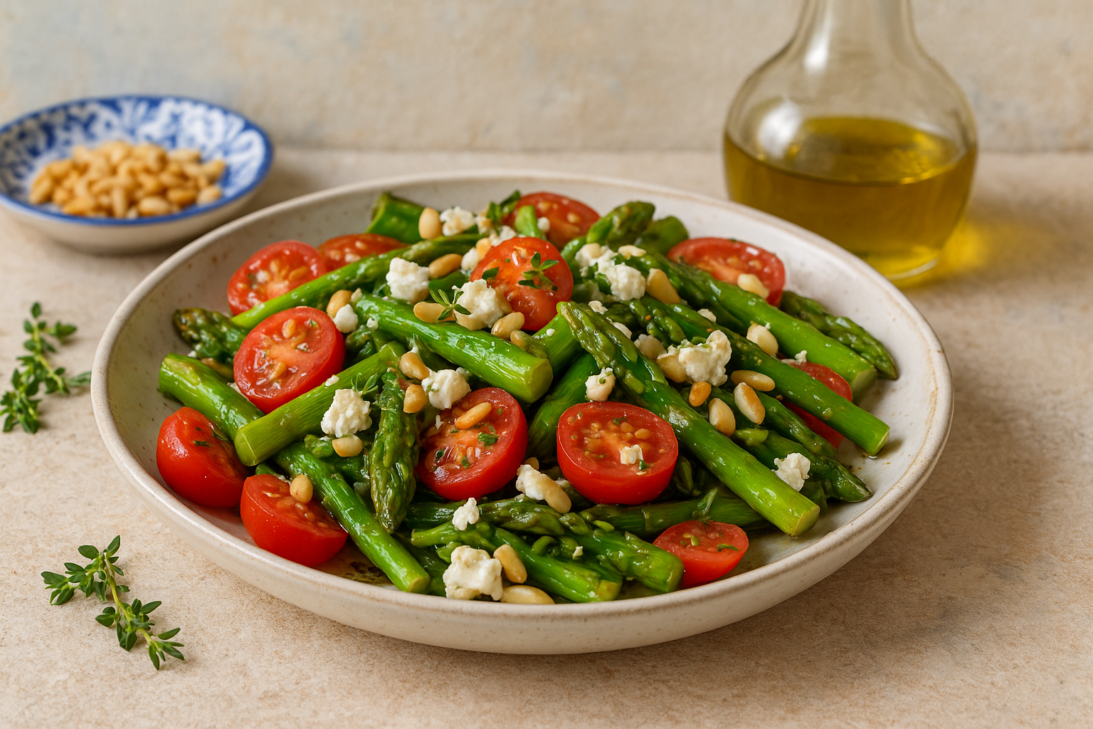 Αυτή η ελληνική σαλάτα με σπαράγγια και ντοματίνια συνδυάζει τραγανά πράσινα σπαράγγια, ζουμερά ντοματίνια και κρεμώδες φέτα σε ένα ελαφρύ, γευστικό πιάτο.