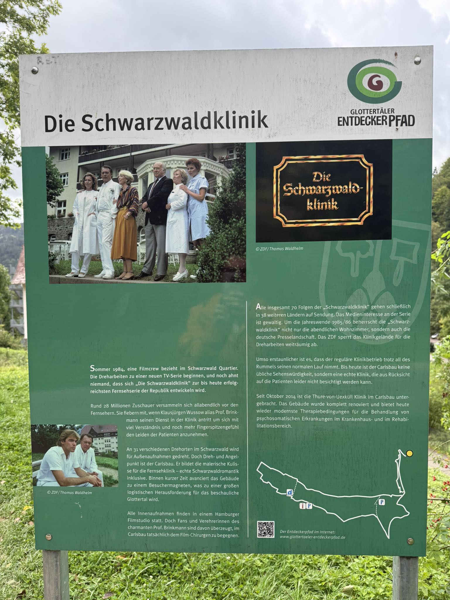 Wer heute den Carlsbau besucht, spürt den Glanz dieser Fernsehgeschichte. Besucher parken am öffentlichen Parkplatz an der Talstraße beim Panorama-Freibad und legen einen 15-minütigen Fußweg leicht ansteigend zurück. Die Klinik selbst bleibt ein funktionierendes Haus, das nur von außen bestaunt werden kann – ein stiller Zeuge der Ära, in der der Schwarzwald ins Fernsehen zog und Millionen Herzen eroberte. (nb)