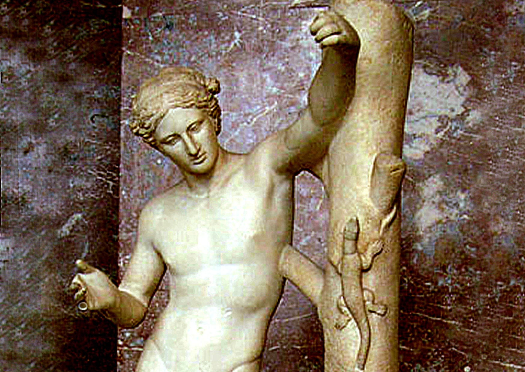 Geschichte – Diese Darstellung, bekannt als Apollon Sauroktonos – der „Echsentöter“ –, stammt ursprünglich von dem berühmten griechischen Bildhauer Praxiteles aus dem 4. Jahrhundert v. Chr. Praxiteles war bekannt für seine Fähigkeit, Götter in menschlicher Gestalt darzustellen, voller Anmut und natürlicher Schönheit. Seine Werke, darunter auch die berühmte Aphrodite von Knidos, zeichneten sich durch eine sanfte Modellierung und eine betonte Körperhaltung aus, die Bewegung und Ruhe zugleich ausdrückten.